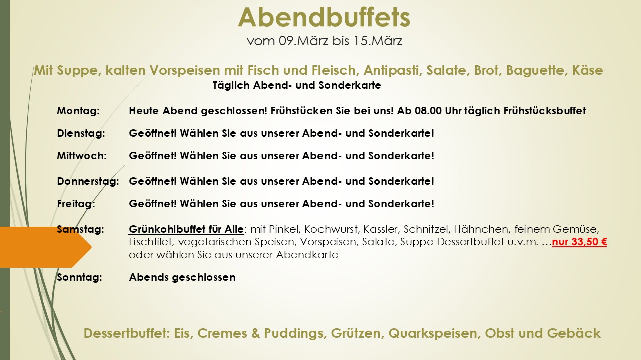 Sie finden bei uns alles was das Herz begehrt: Suppen, Vorspeisen, Salate, Fisch, Fleisch, vegetarische Gerichte sowie verschiedene Desserts. Schauen Sie in unseren aktuellen Buffetkalender mit den Themenbuffets. Zusätzlich bieten wir eine Abendkarte und eine wechselnde Saisonkarte. Sie haben die Wahl!